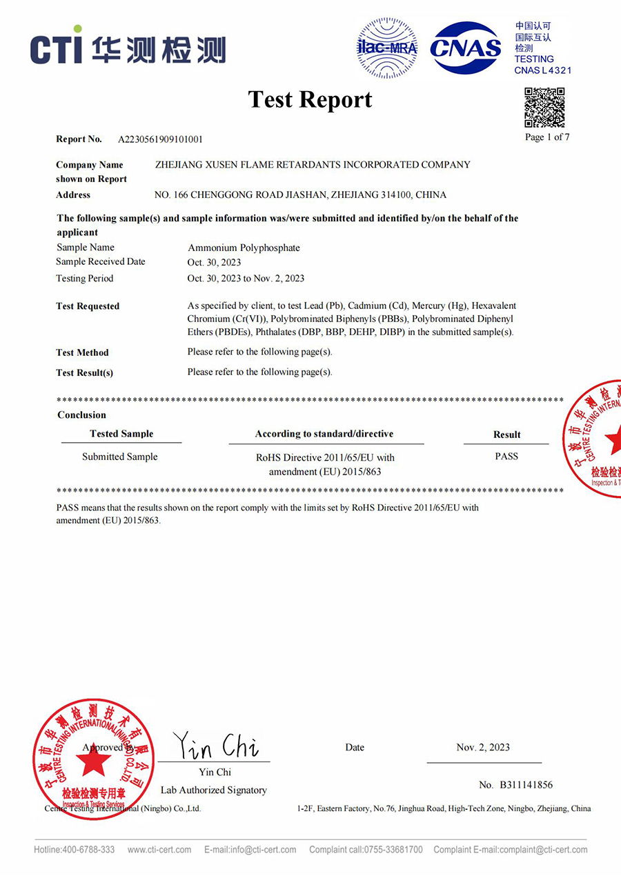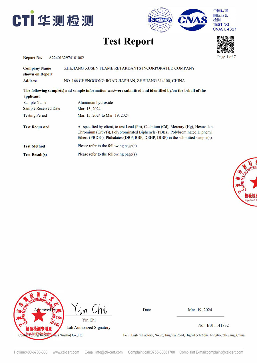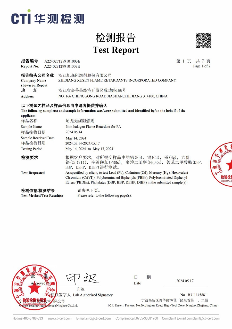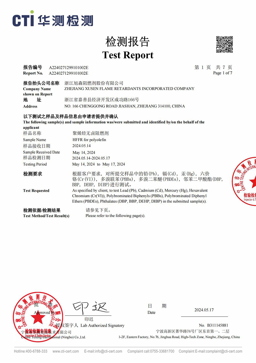 مهار کننده شعله برای گزارش تست پلی الیفین ROHS
